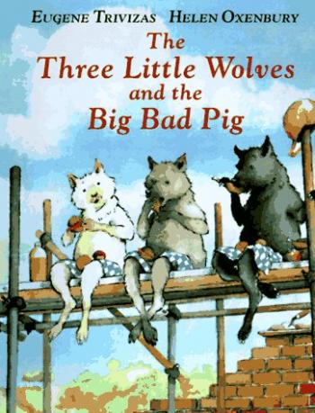 This story begins as expected, with three wolf siblings going off into the world to seek their fortunes, and being warned to beware of the big bad pig. The building materials get a bit of an update though: brick is only the beginning. We also see concrete, armor plates, and even a video entrance phone. This big bad pig seems to have shallower lungs than the wolf of lore, for he has to resort to other efforts to fullly knock down houses, such as a sledgehammer and even dynamite.